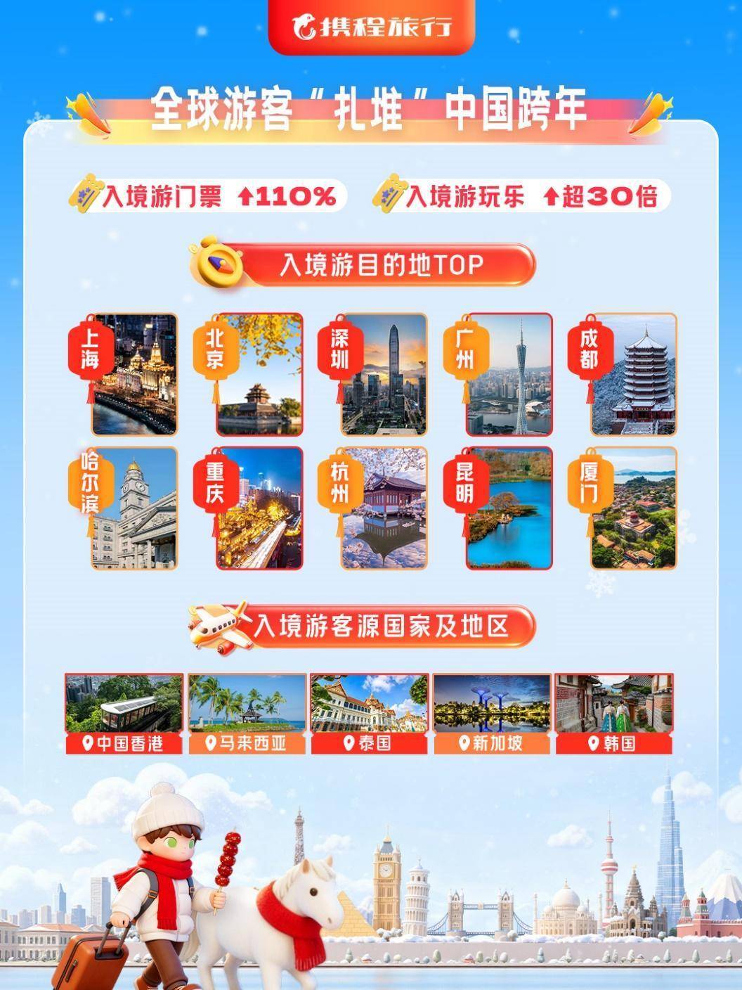 元旦假期,入境游市集保捏强劲增长,携程门票预订量同比增110%,入境体验型玩乐产物预订量增长超30倍。热点方针地包括上海、北京、深圳、广州、成都、哈尔滨、重庆、杭州、昆明、厦门,主要客源国度及地区为中国香港、马来西亚、泰国、新加坡、韩国等地。