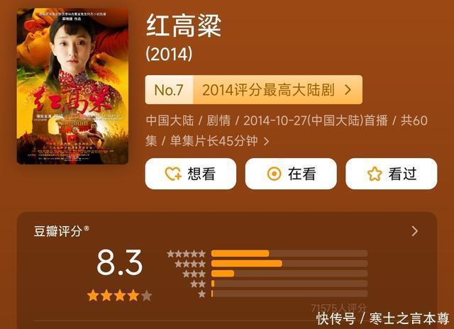 固然还合计男主主角陈都灵和辛云来的演技还有待擢升,但关于一部古偶来说照旧合格了,是以大致有0.354的收视也说得昔时。 第六名:《红高粱》 要我说,这才是经典老剧,剧情不狗血,年代感透澈,最主要的是剧中东说念主物描述很立体,比较于其一些老剧来说,可以重温许多遍而不腻。 天然,该剧的制作团队亦然顶级,郑晓龙抓导,周迅、朱亚文、于荣光、秦海璐、黄轩主演,演员气势雄壮。