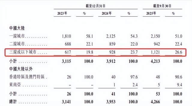尽管一线城市门店占比有所下落,但仍为中枢布局区域,2025年前三季度仅净新增25家门店,增长近乎停滞。