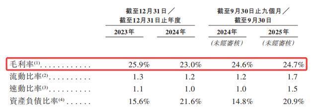 招股书骄矜,2023年至2024年,公司毛利率从25.9%降至23%,2025年前三季度虽回升至24.7%,但举座呈波动下落趋势。