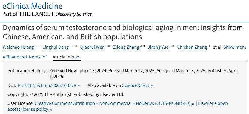2025年,四川大学华西病院聚会多国团队在《柳叶刀》子刊发表的盘考指出,男性血清睾酮水平越高,生物年齿增长就越慢。该盘考共对中好意思英三国的1.7万余名受试者进行了走访,通过走访受试者体内的睾酮水平,将他们分红4组。
