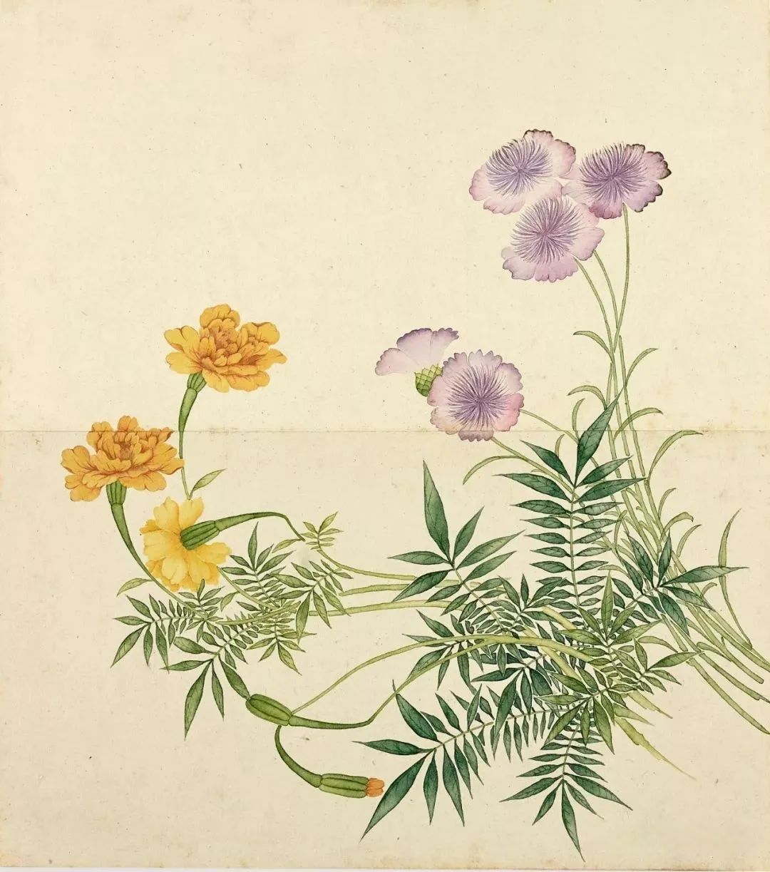 全册构图疏密有致,遐迩相生。近景松石用工笔,中景云鹤用没骨,前景桃林以意笔写之,档次分明。设色尤见匠心,青绿为主调,间以朱砂、石青、泥金,色不掩墨,墨分其肉,深得宋元重彩之遗意。尤可称谈者,仙翁衣纹以兰叶描,鹿角以游丝描,鹤颈以铁线描,各尽其态,非高东谈主不可为。