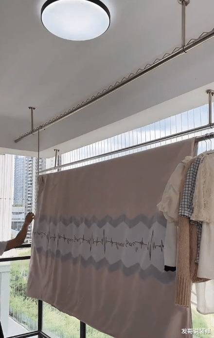 电动晾衣架天然好,但看起来不太结子。手摇晾衣架也可以,即是多出来一堆线,也曾有点丑,其实大可无须把晾衣架装中间,它的场地即是曝晒,在客厅看到一堆吊挂的一稔,确凿认为沉静吗?