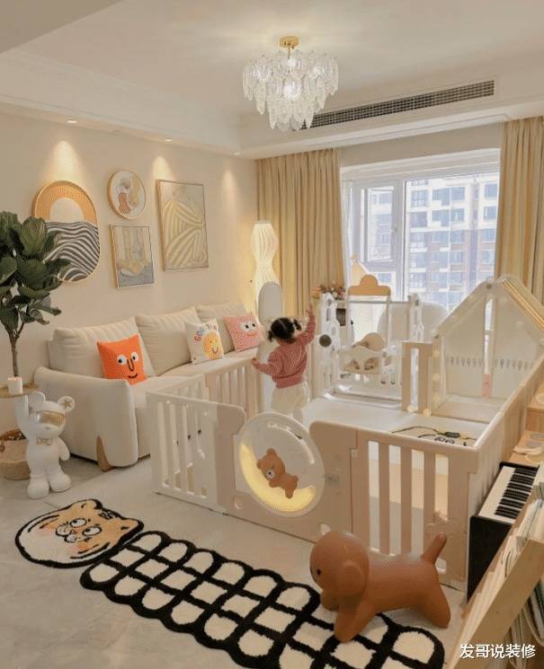 如若家里有一个宝宝,可以为他打造一个蒙氏客厅,用围栏给孩子作念了个属于她的斗室子,可以一会滑滑梯、一会投篮、一会荡秋千,不单是是一个宝宝围栏游戏区,亦然专属于她的高明小基地。