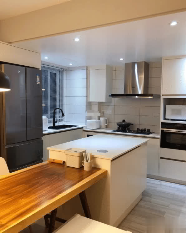 其实绽放式厨房不仅可以扩大了视觉空间,而况也能让厨房气派和客厅气派一致如鱼似水,客厅变得愈加亮堂;时作念饭可以更有用的疏通,夏天还有可以和客厅共用空调,我认为这才是作念绽放式厨房最突出念念真义的事情。