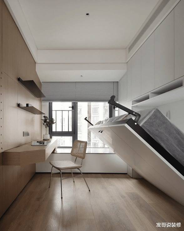 除了收纳柜并莫得扬弃占面积的制品床。平日里这个空间不仅领有充足到收纳储物力,可以行为储物间使用,由于大地空间充足,还可以行为健身与瑜伽的空间。在柜体中,其实荫藏了一个隐形床,家里来来宾的时候放下来立马变客房‼️哪怕永劫候不住东说念主,空间也不会闲置糜掷,清扫起来也会很拖沓。